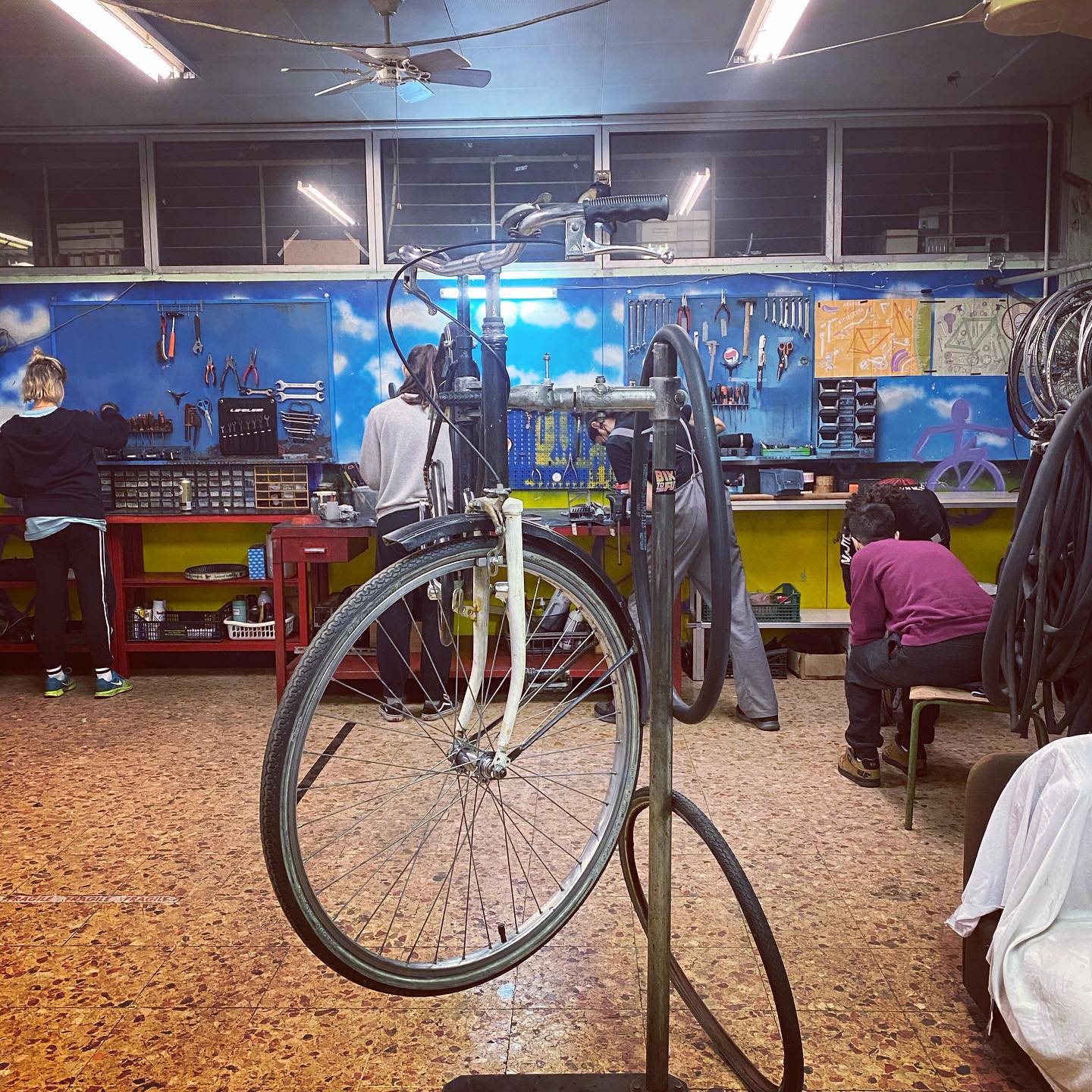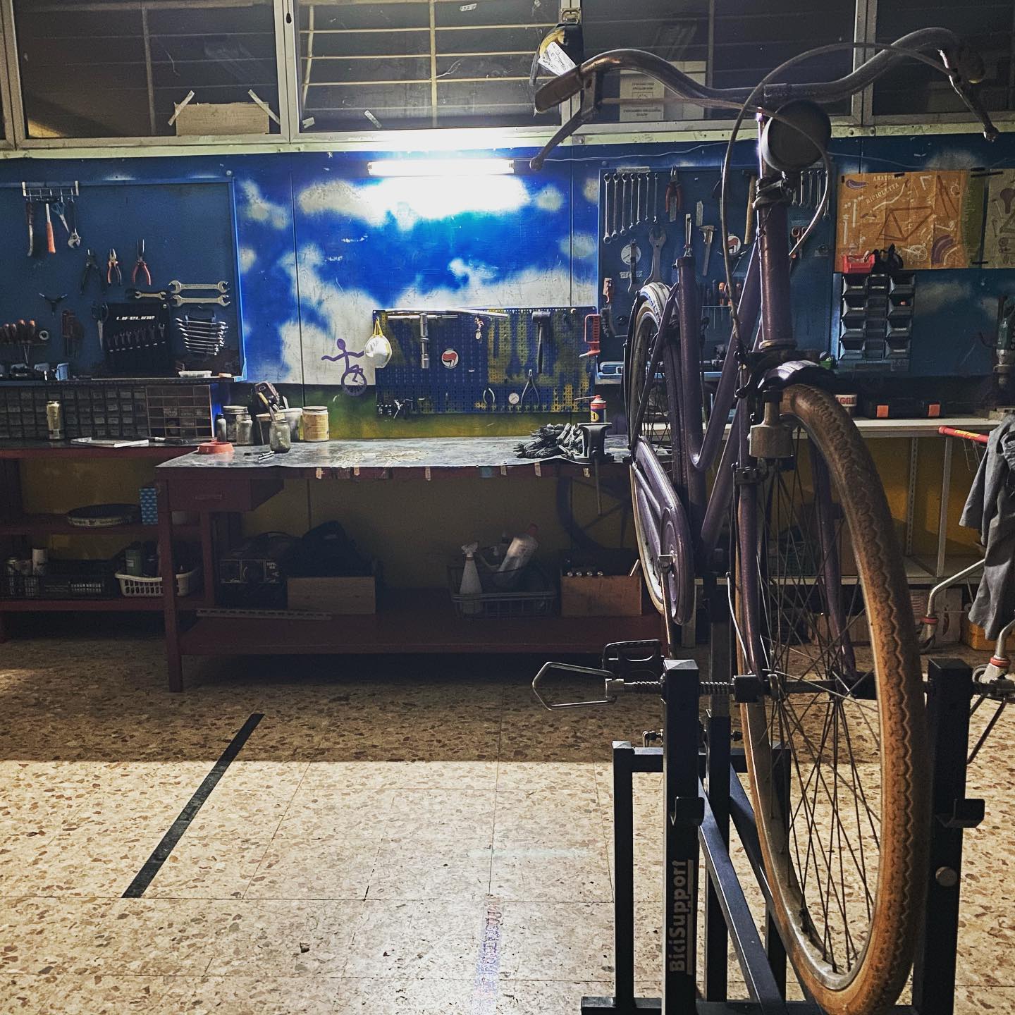 Nuovo impianto elettrico, nuova sistemazione delle postazioni – sia banchini che attrezzi – grandi pulizie, angolino per thè caldo e biscottini, attaccapanni e porta borse, appendi ruote super fico.. e, #spoiler, tante bici pronte per un’asta che potrebbe esserci a breve…