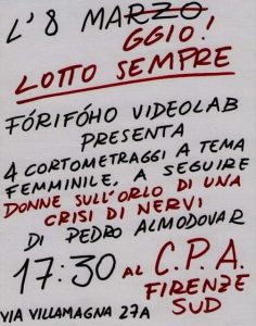 CPA Fi-Sud e ForiFoco videolab presentano sabato 8 maggio dalle ore 17:30 la proiezione di quattro cortometraggi a tema femminile e del film “Donne sull’orlo… Leggi tutto »Lotto marzo tutto l’anno