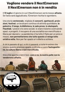 Ci è arrivata la notizia che il 13 luglio il Next Emerson, storica occupazione di Firenze nord, andrà all’asta. Nel caso in cui qualche speculatore dovesse decidere di accaparrarsi l’ennesimo pezzo di città le compagne e i compagni rischierebbero lo sgombero.Leggi tutto »GLI SPAZI SOCIALI NON SI SGOMBERANO