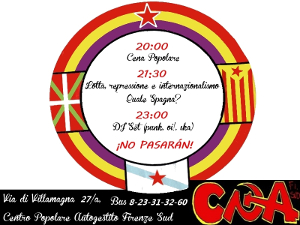 VENERDI’ 4 LUGLIO 2014 Alle ore 20.00 Cena popolare Alle ore 21.00 Iniziativa e dibattito LOTTA, REPRESSIONE, INTERNAZIONALISMO: QUALE SPAGNA? Alle ore 23.00 Dj set… Leggi tutto »LOTTA, REPRESSIONE, INTERNAZIONALISMO: QUALE SPAGNA?