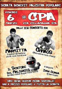 Ore 21:00 Cena popolare Ore 23:00 Inizio concerti: Carlos Dunga(trash soccer punk Firenze) Orsetti hc(hardcore Padova) Zeromila(hardcore melodico Padova)