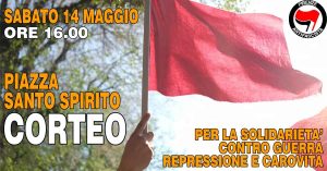 FUORI DALL’EMERGENZA GUERRA E REPRESSIONE, DENTRO L’URGENZA DELLA SOLIDARIETÀ E DEL CAMBIAMENTO. SABATO 14 MAGGIO, ORE 16.00 PIAZZA SANTO SPIRITO LA FIRENZE ANTIFASCISTA SARÁ IN… Leggi tutto »14 Maggio: CORTEO | SOLIDARIETA’ vs GUERRA REPRESSIONE E CAROVITA