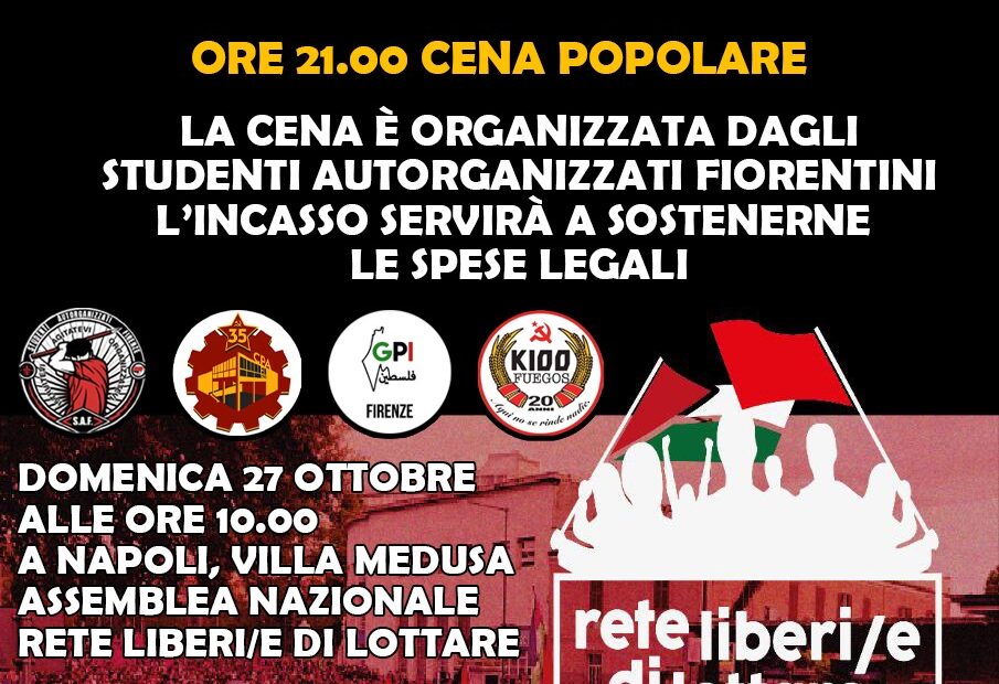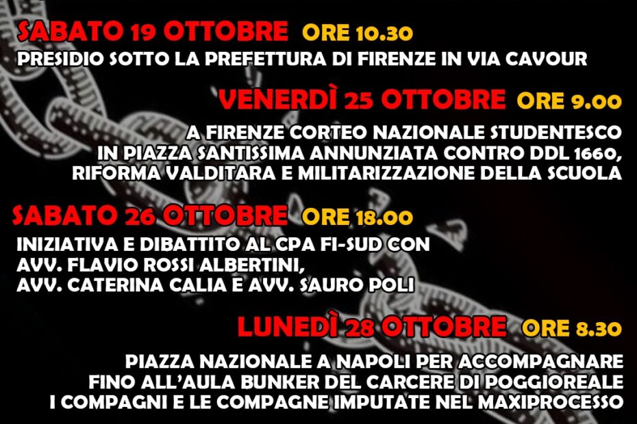 Sabato 26 Ottobre al CPA Fi-Sud, iniziativa e dibattito sul DDL 1660. Domenica 27 e Lunedì 28 a Napoli, assemblea nazionale della Rete Liberi/e di Lottare e manifestazione di solidarietà.