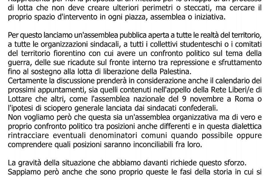 Giovedì 7 Novembre, lanciamo un’assemblea pubblica aperta a tutte le realtà del territorio, a tutte le organizzazioni sindacali, a tutti i collettivi studenteschi o i comitati del territorio fiorentino con cui avere un confronto politico sul tema della guerra, delle sue ricadute sul fronte interno tra repressione e sfruttamento fino al sostegno alla lotta di liberazione della Palestina.