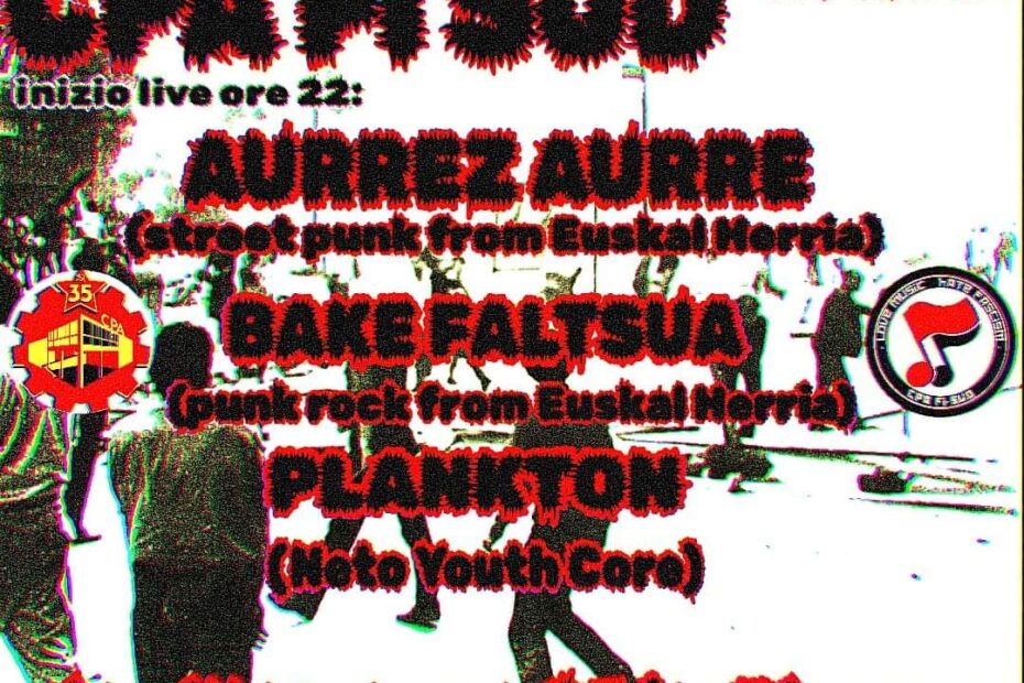 Sabato 26 Ottobre, concerto con due gruppi punk di compagni direttamente da Euskal Herria, Bake Faltsua e Aurrez Aurre. A fare gli “onori di casa” i Plankton.