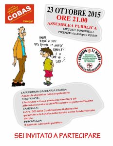 VENERDI’ 23 OTTOBRE ORE 21,00 LA SALUTE E’ UN DIRITTO NON UNA MERCE!Leggi tutto »VENERDI’ 23 OTTOBRE ORE 21,00 LA SALUTE E’ UN DIRITTO NON UNA MERCE!