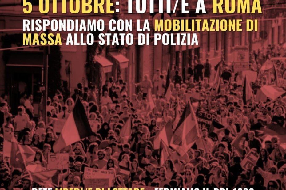 Pubblichiamo la presa di posizione della Rete Liberi/e di Lottare sulla manifestazione del 5 Ottobre, sottolineando che oggi 25 Settembre la Questura di Roma ha emesso formalmente il provvedimento di divieto dei cortei a Roma.
