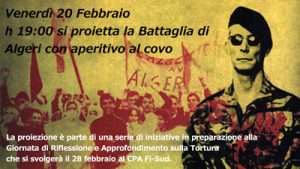 Ore 21.00 Cena di Finanziamento per la Giornata di Riflessione e Approfondimento sulla Tortura Per Tutt* quell* che sarebbero stati a casa, sarà proiettata la… Leggi tutto »19 Febbraio 2015
